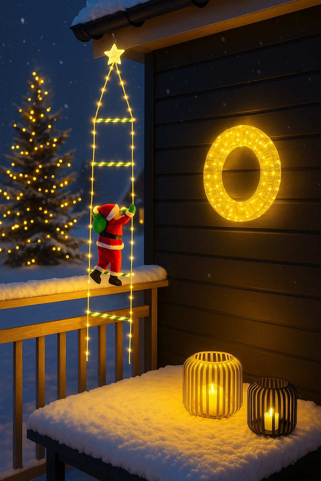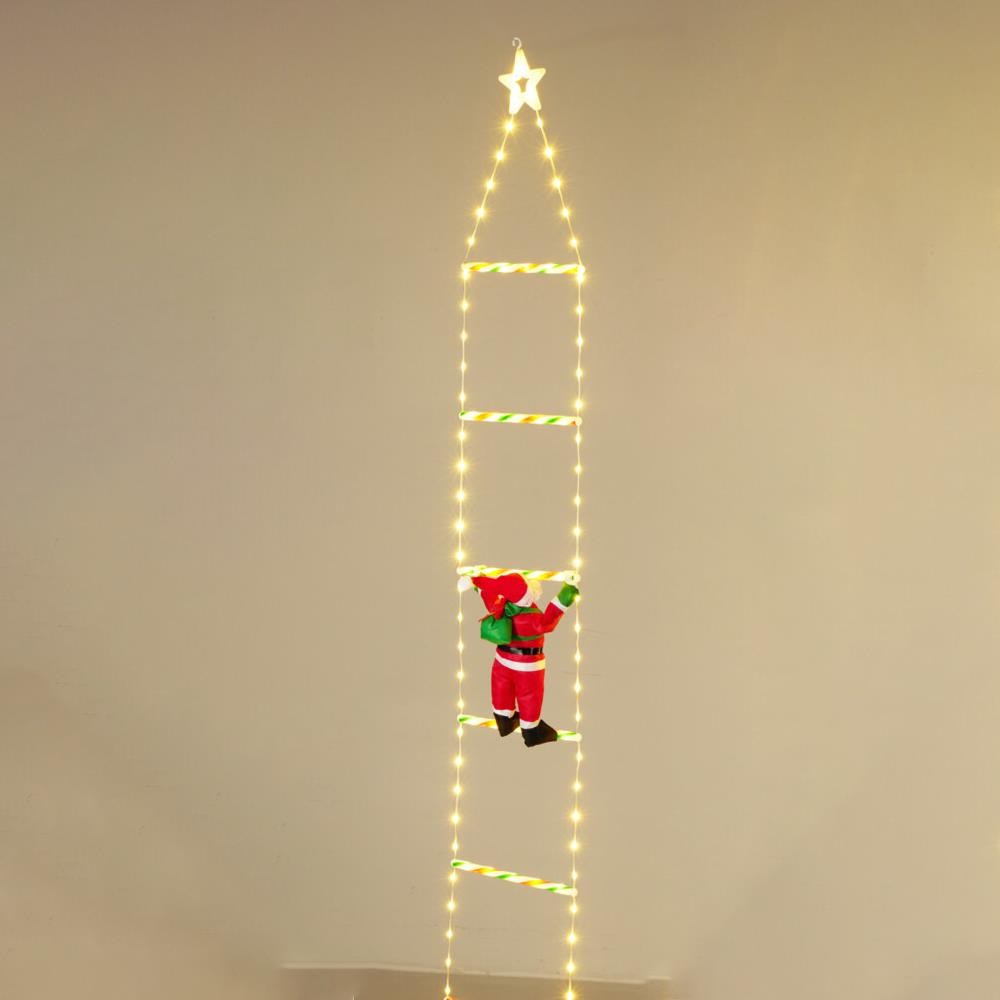 Δημιουργήστε μοναδική χριστουγεννιάτικη ατμόσφαιρα με τον Άγιο Βασίλη σε σκάλα με ενσωματωμένα LED φωτάκια. Το εντυπωσιακό ύψος των 2 μέτρων και οι 124 θερμές λευκές λάμπες LED χαρίζουν μαγική λάμψη στον χώρο σας, ιδανικό για μπαλκόνι, βιτρίνα ή εσωτερική διακόσμηση. Διαθέτει 8 λειτουργίες φωτισμού και χρονοδιακόπτη 6/18 ωρών για εύκολη χρήση.