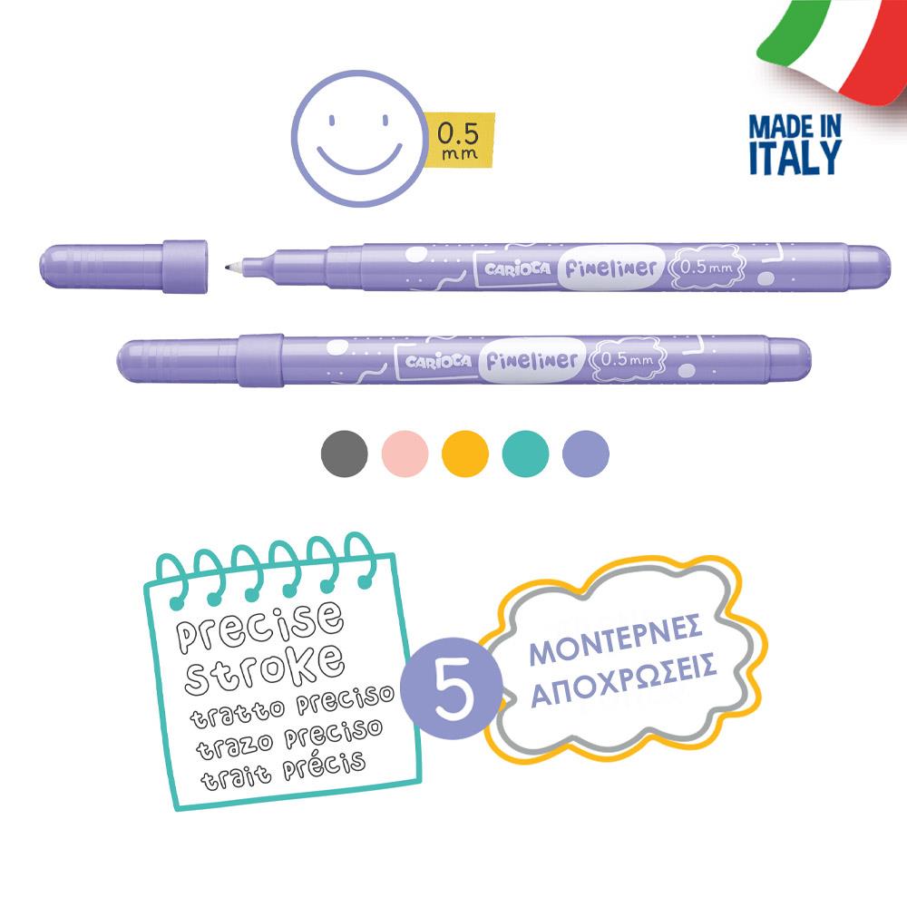 Οι Carioca fineliner Music είναι μαρκαδόροι λεπτής γραφής ιδανικοί για γράψιμο, σημειώσεις και δημιουργικές εργασίες. Διαθέτουν ανθεκτική μύτη acetal που προσφέρει ακριβή γραμμή 0.5 mm, ενώ τα φωτεινά χρώματα παραμένουν έντονα χωρίς να ξεθωριάζουν στο φως. Σετ 5 τεμαχίων.