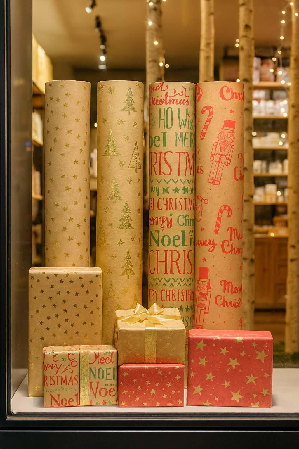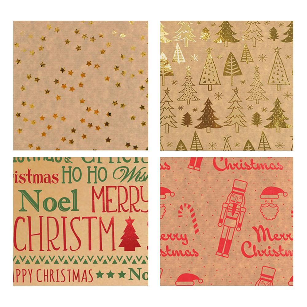Σετ χριστουγεννιάτικων craft χαρτιών περιτυλίγματος με 4 εντυπωσιακά σχέδια και ανάγλυφη χρυσή εκτύπωση (hot stamp). Διαθέτει φυσική καφέ βάση με εορταστικά μοτίβα όπως αστέρια, ευχές και δέντρα, προσφέροντας λαμπερό και κομψό αποτέλεσμα. Ιδανικό για όσους αγαπούν το eco-friendly αλλά πολυτελές περιτύλιγμα.