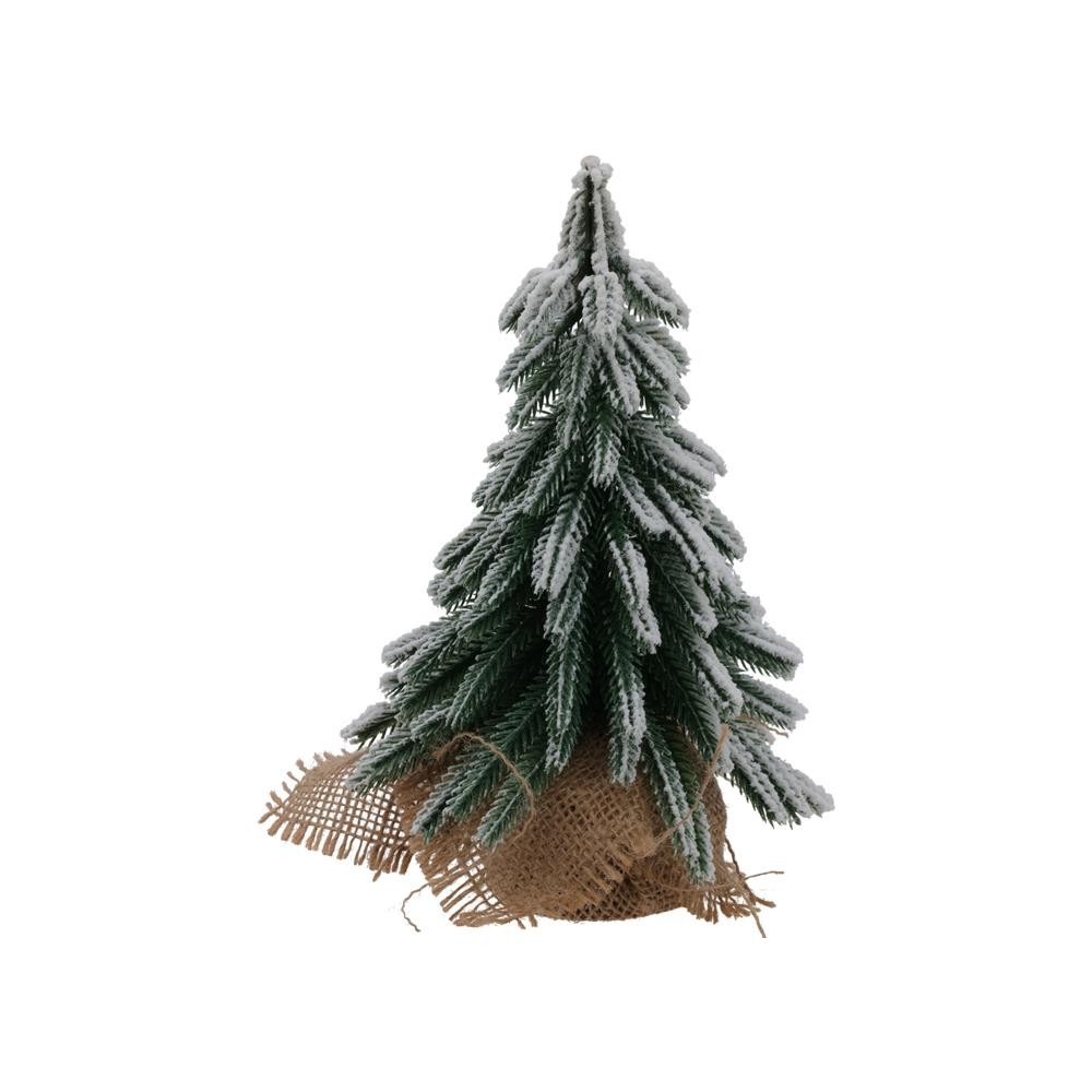 Χριστουγεννιάτικο δέντρο ύψους 24εκ., κατασκευασμένο από polyester με πράσινο χρώμα και χιονισμένο εφέ για χειμωνιάτικη ατμόσφαιρα. Η βάση του είναι από ξύλο πεύκου και τυλιγμένη με λινάτσα και βαμβάκι, δίνοντας φυσική και ζεστή όψη. Ιδανικό για τραπέζια, ράφια και μικρούς χώρους που χρειάζονται γιορτινή διακόσμηση.