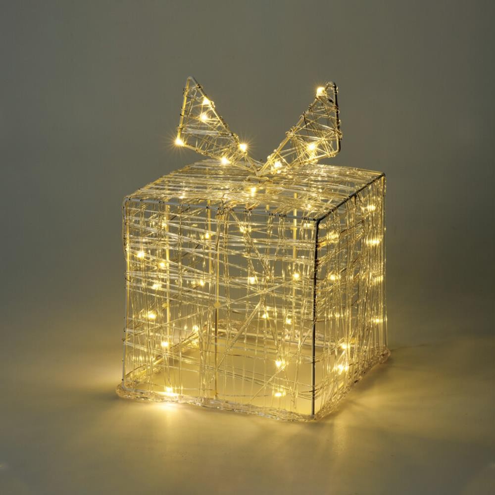 Χριστουγεννιάτικο διακοσμητικό σε σχήμα δώρου με ενσωματωμένο LED φωτισμό. Κατασκευασμένο από ακρυλικό, διαθέτει 30 μικρο-LED σε θερμό λευκό χρώμα, που χαρίζουν εντυπωσιακή λάμψη στον χώρο. Λειτουργεί με μπαταρίες και ενσωματωμένο χρονοδιακόπτη για εύκολη χρήση, χωρίς καλώδια. Ιδανικό για να τοποθετηθεί κάτω από το δέντρο, σε τραπέζι ή σε βιτρίνα.