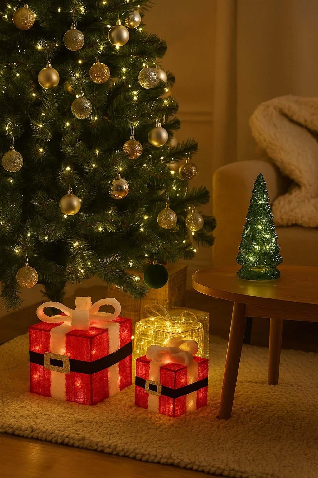 Σετ δύο χριστουγεννιάτικων διακοσμητικών σε σχήμα δώρου με LED φωτισμό. Κατασκευασμένα από PE και μέταλλο, σε κόκκινη απόχρωση με λευκό φιόγκο, δημιουργούν ζεστή γιορτινή ατμόσφαιρα στον χώρο. Το σετ περιλαμβάνει δύο μεγέθη με θερμό λευκό φωτισμό και λειτουργία χρονοδιακόπτη 6/18 ωρών, ιδανικά για να τοποθετηθούν κάτω από το δέντρο, στο σαλόνι ή σε μπαλκόνι.
