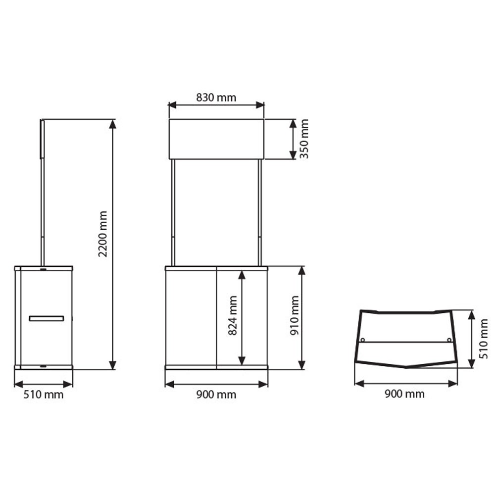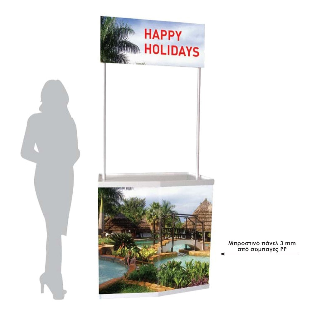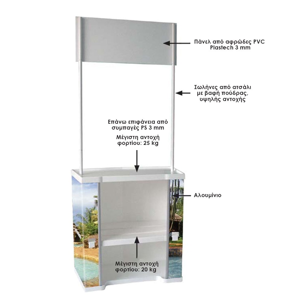 Ο πάγκος διαθέτει επάνω header για προβολή λογοτύπου ή μηνύματος, καθώς και μπροστινό πάνελ πάχους 3χιλ. για εκτύπωση υψηλής ποιότητας. Είναι πτυσσόμενος και συναρμολογείται εύκολα χωρίς εργαλεία, καθιστώντας τον ιδανικό για συχνές μετακινήσεις.