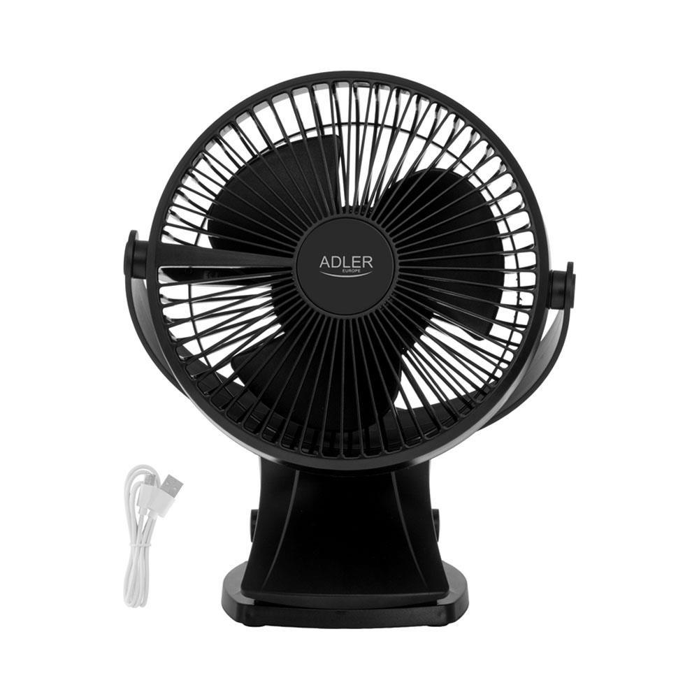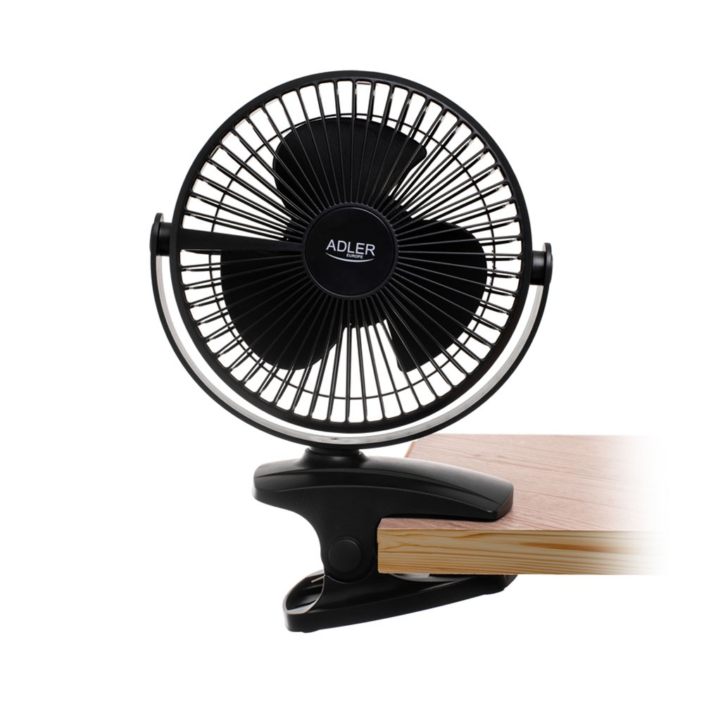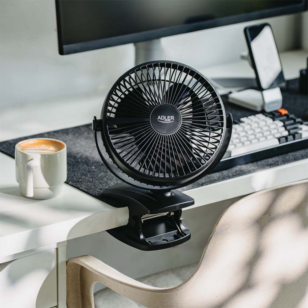 Επαναφορτιζόμενος ανεμιστήρας γραφείου Adler με κλιπ 15.5 εκ., περιστροφή 360°, αθόρυβος USB-C μαύρος