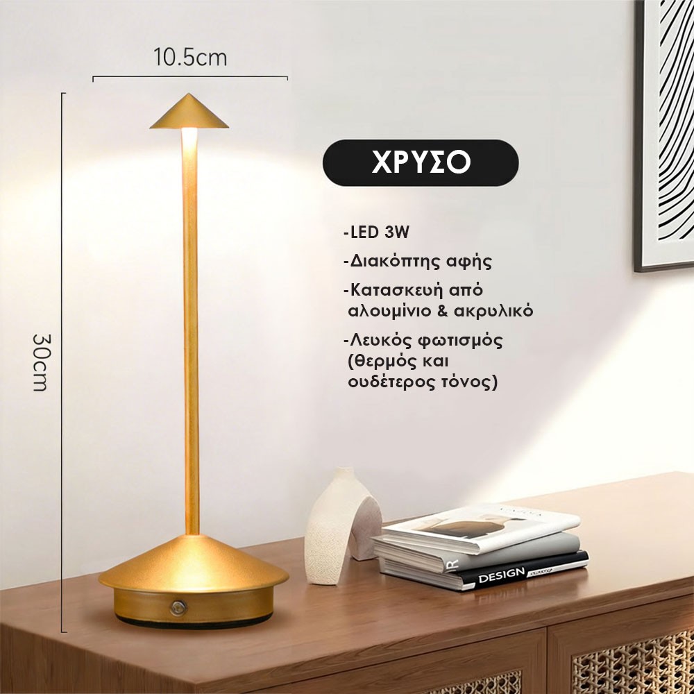 Μοντέρνο επαναφορτιζόμενο LED φωτιστικό ιδανικό για σπίτι, γραφείο αλλά και επαγγελματικούς χώρους όπως καφέ, εστιατόρια και ξενοδοχεία. Ο minimal σχεδιασμός του προσφέρει κομψότητα και ζεστή ατμόσφαιρα, ενώ η λειτουργία αφής εξασφαλίζει άμεση και εύκολη χρήση. Ελαφρύ, ανθεκτικό και φορητό, μεταφέρεται εύκολα σύμφωνα με τις ανάγκες του χώρου.