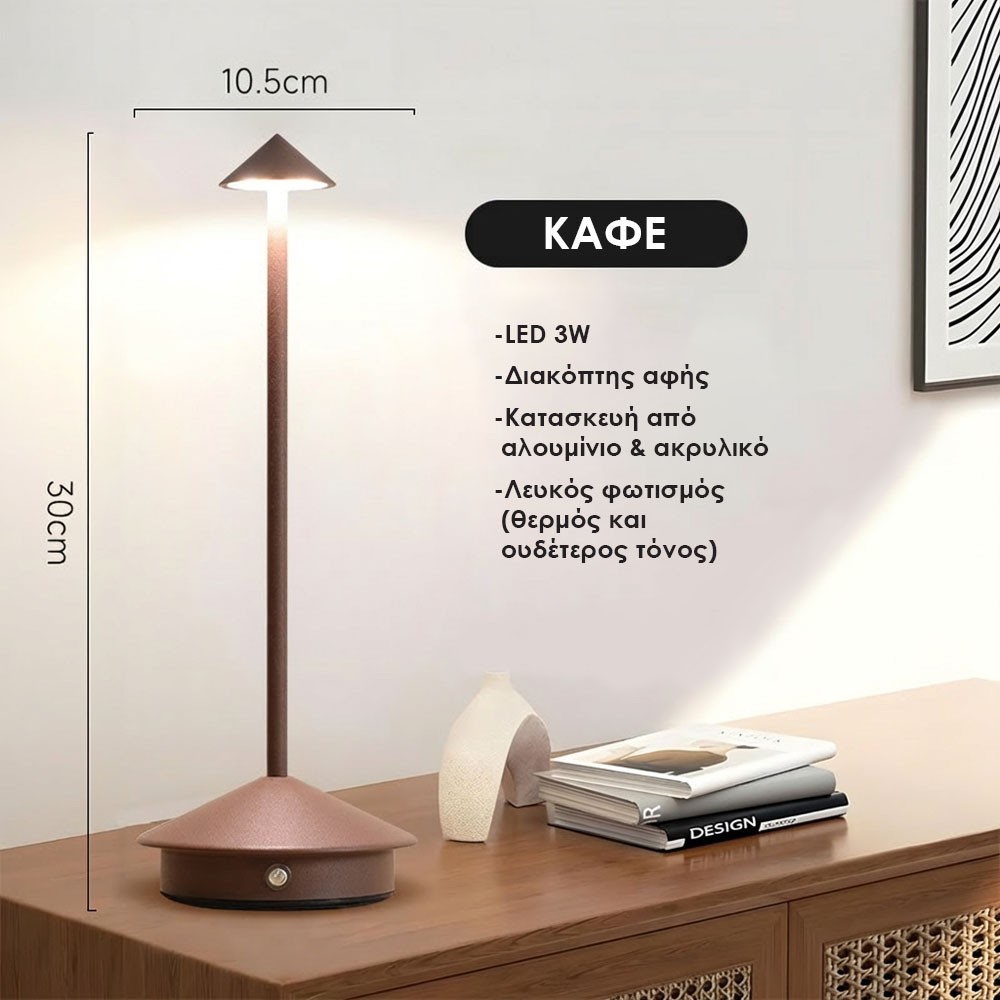 Μοντέρνο επαναφορτιζόμενο LED φωτιστικό ιδανικό για σπίτι, γραφείο αλλά και επαγγελματικούς χώρους όπως καφέ, εστιατόρια και ξενοδοχεία. Ο minimal σχεδιασμός του προσφέρει κομψότητα και ζεστή ατμόσφαιρα, ενώ η λειτουργία αφής εξασφαλίζει άμεση και εύκολη χρήση. Ελαφρύ, ανθεκτικό και φορητό, μεταφέρεται εύκολα σύμφωνα με τις ανάγκες του χώρου.