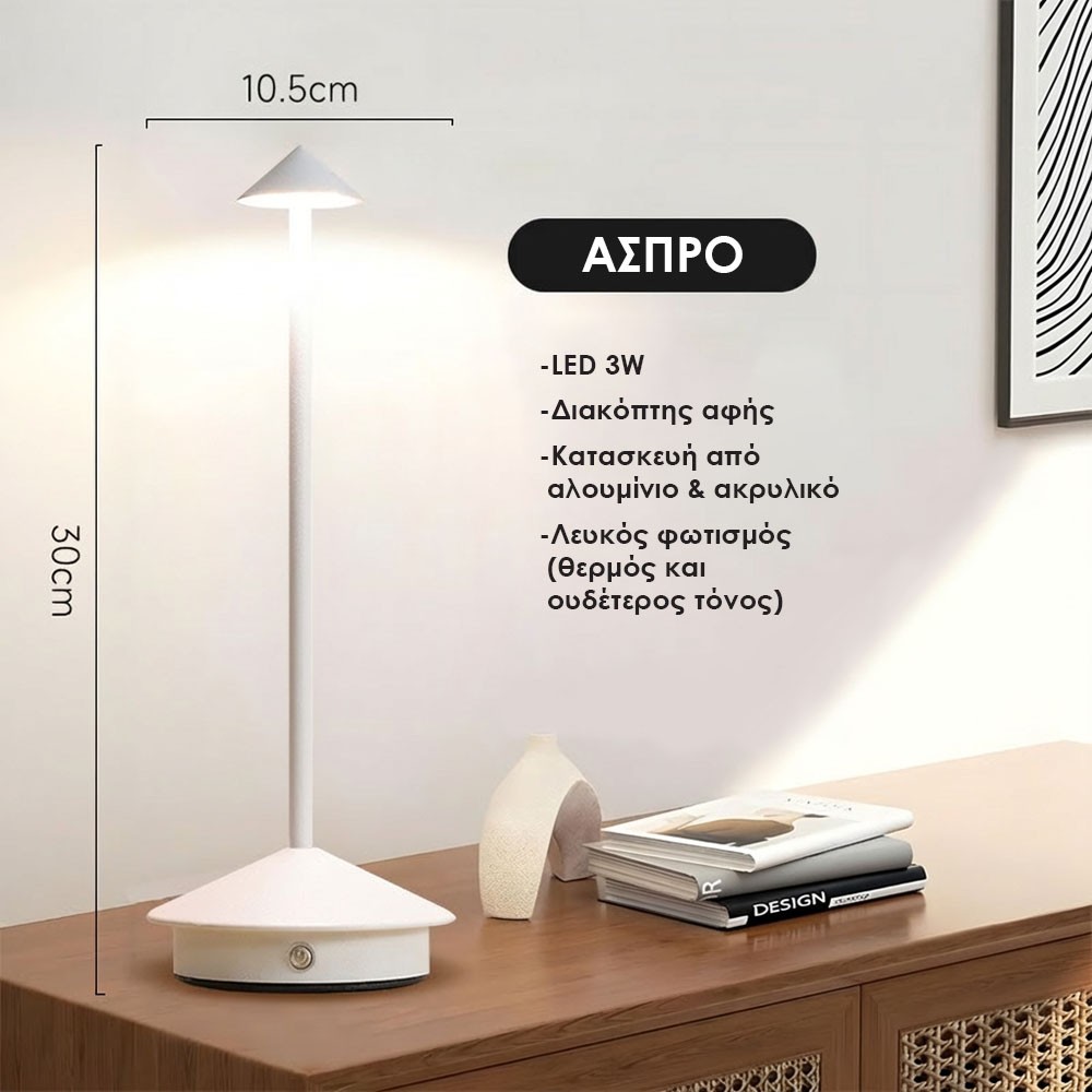 Μοντέρνο επαναφορτιζόμενο LED φωτιστικό ιδανικό για σπίτι, γραφείο αλλά και επαγγελματικούς χώρους όπως καφέ, εστιατόρια και ξενοδοχεία. Ο minimal σχεδιασμός του προσφέρει κομψότητα και ζεστή ατμόσφαιρα, ενώ η λειτουργία αφής εξασφαλίζει άμεση και εύκολη χρήση. Ελαφρύ, ανθεκτικό και φορητό, μεταφέρεται εύκολα σύμφωνα με τις ανάγκες του χώρου.