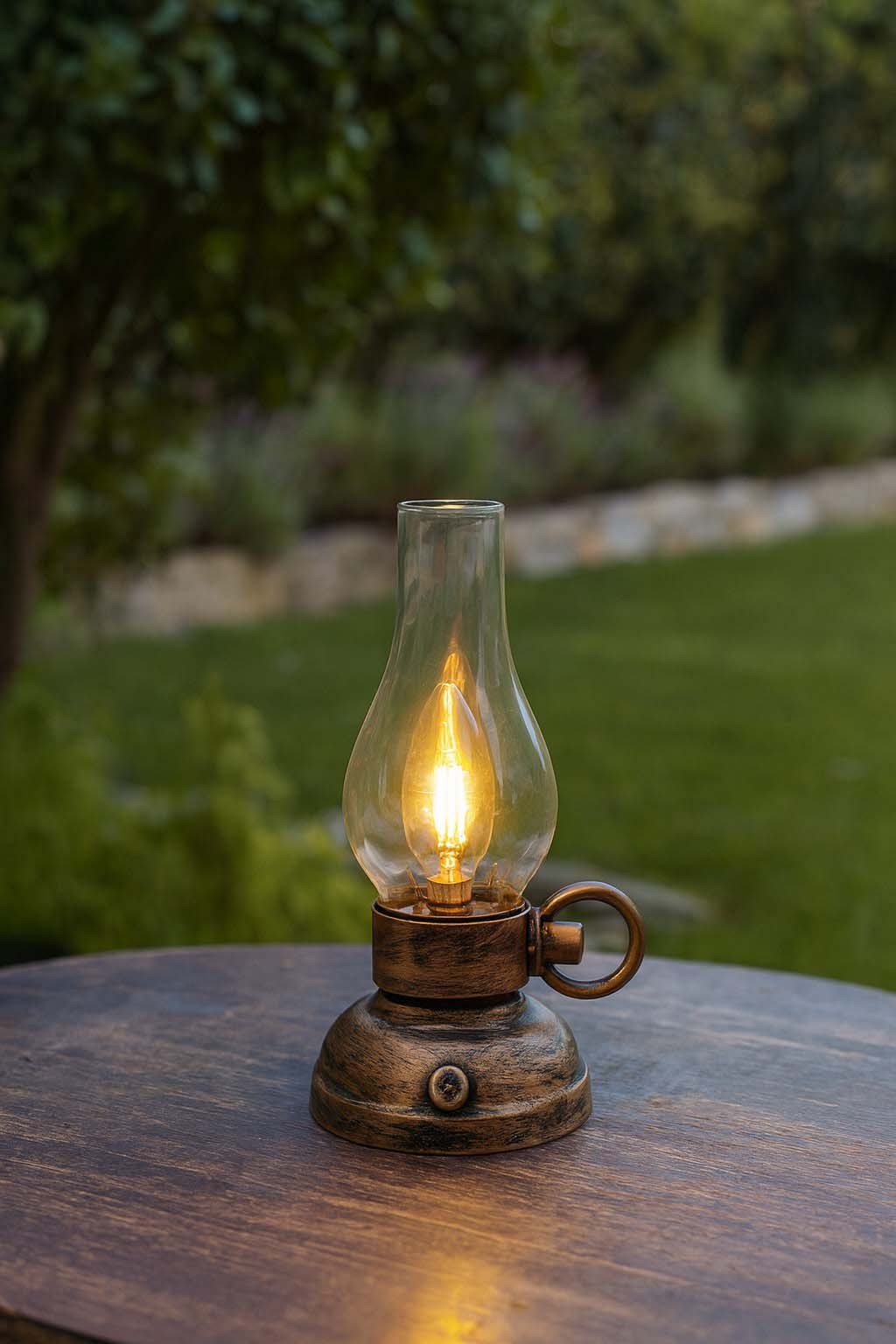 Μεταλλικό φανάρι με γυαλί σε χρυσό αντικέ φινίρισμα, που συνδυάζει κλασική αισθητική με σύγχρονη λειτουργικότητα. Διαθέτει ενσωματωμένο LED σε θερμό λευκό χρώμα και dimmer για να προσαρμόζετε την ένταση του φωτός ανάλογα με την ατμόσφαιρα που θέλετε να δημιουργήσετε. Ιδανικό για εσωτερική διακόσμηση, τραπέζια, ράφια ή για να δώσει αίσθηση ζεστασιάς σε κάθε χώρο.