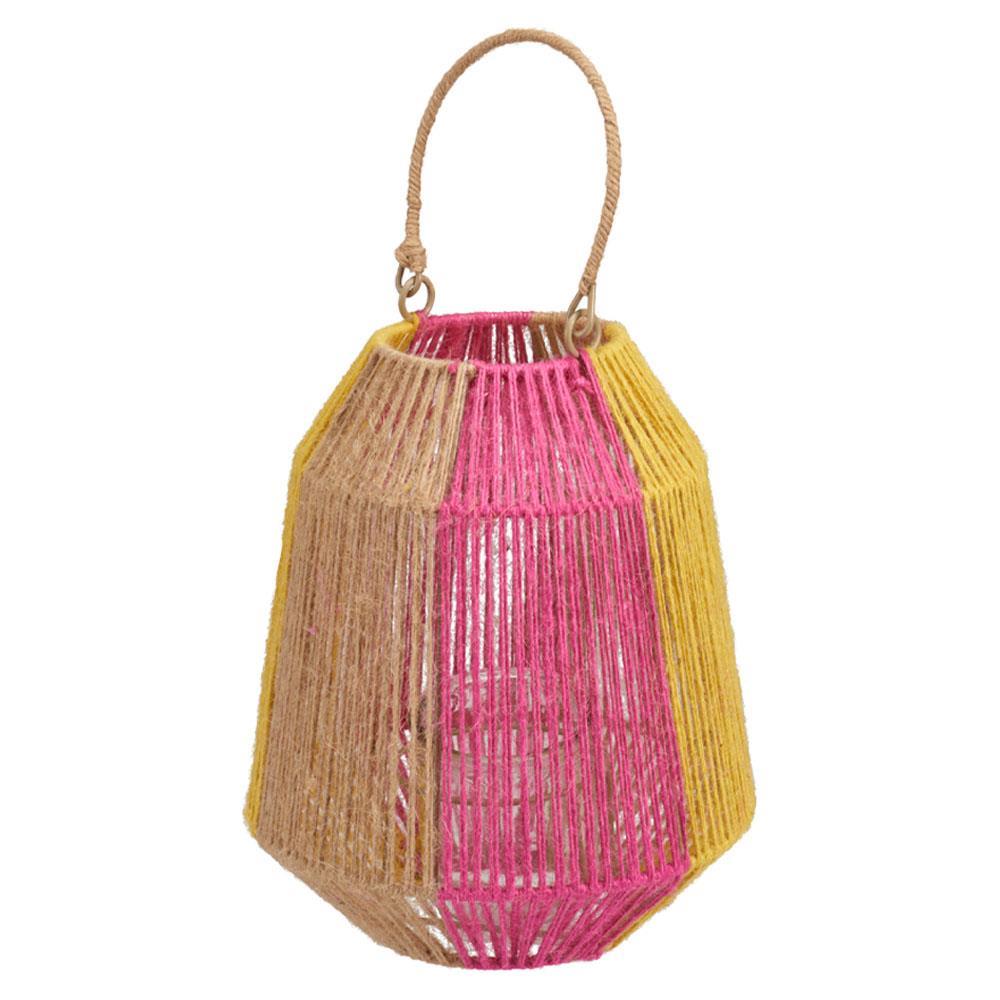 Φανάρι μεταλλικός σκελετό, γυαλί και γιούτα ροζ-κίτρινο 21×21×25εκ.