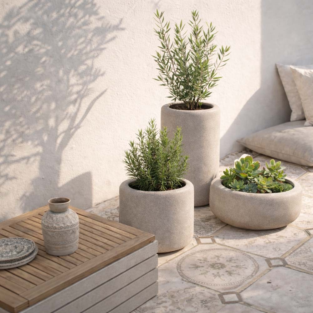 Η απόχρωση μπεζ ενσωματώνεται εύκολα σε φυσικά και minimal περιβάλλοντα, ενώ η ανθεκτική πλαστική κατασκευή της προσφέρει αντοχή σε υγρασία και εξωτερικές συνθήκες. Το αναλογικό της μέγεθος επιτρέπει φυτεύσεις με μεσαία ή πλούσια ανάπτυξη, δημιουργώντας κομψές συνθέσεις πρασίνου.