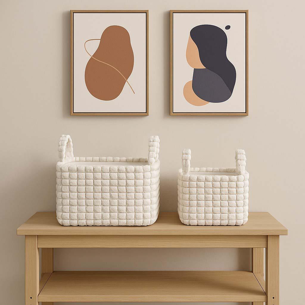 Σετ καλαθιών αποθήκευσης 2 τεμαχίων με χερούλια. Το σετ περιλαμβάνει ένα μεγάλο και ένα μικρό καλάθι, ιδανικά για την οργάνωση και διακόσμηση του σπιτιού. Ο συνδυασμός διαφορετικών υφασμάτων και μοτίβων προσδίδει ιδιαίτερο χαρακτήρα, ενώ τα χερούλια προσφέρουν ευκολία στη μετακίνηση.