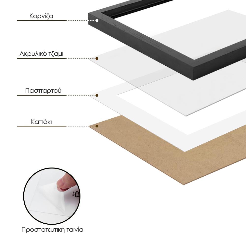 Κορνίζα τοίχου από ξύλο, ιδανική για φωτογραφίες, αφίσες και διακοσμητικές εκτυπώσεις. Το ακρυλικό τζάμι είναι ελαφρύ και ασφαλές, προσφέροντας καθαρή προβολή της εικόνας χωρίς αντανακλάσεις. Κατάλληλη για το σπίτι, το γραφείο ή επαγγελματικούς χώρους, με εύκολη τοποθέτηση στον τοίχο. Χρώμα: Μαύρο, Διαστάσεις: χωρίς πασπαρτού 60x40εκ.