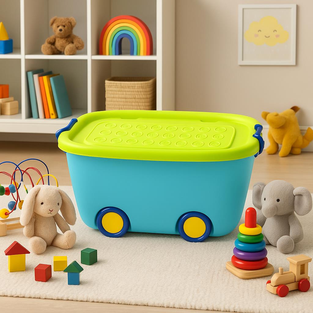 Κουτί αποθήκευσης γαλάζιο με λαχανί καπάκι και 4 ρόδες.