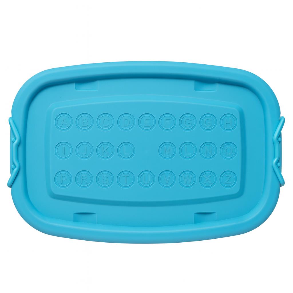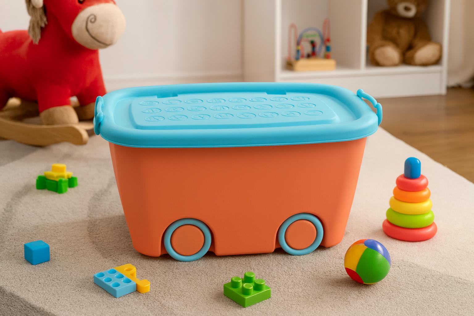 Κουτί αποθήκευσης ροζ με γαλάζιο καπάκι και 4 ρόδες.