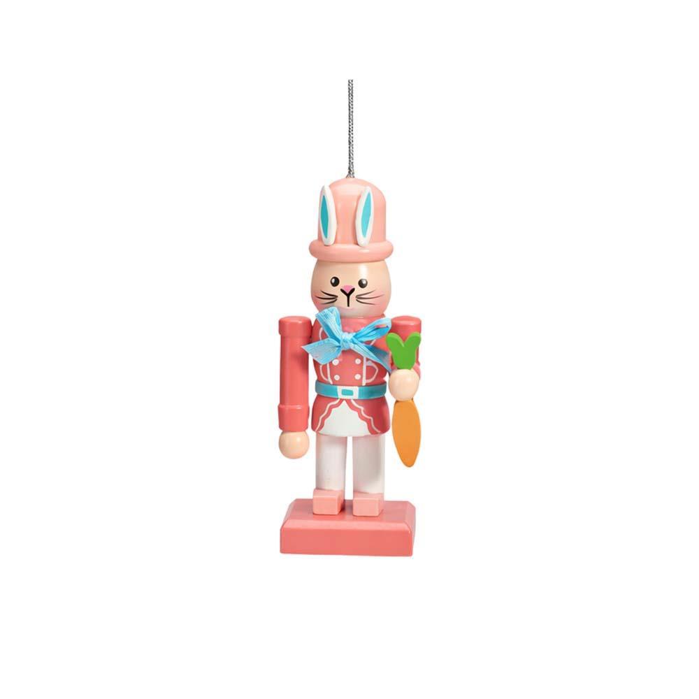 Κρεμαστό πασχαλινό διακοσμητικό λαγουδάκι σε σχέδιο καρυοθραύστης κατασκευασμένο από φυσικό ξύλο πεύκου και mdf. Ιδανικό για διακόσμηση εσωτερικών χώρων, μπορεί να χρησιμοποιηθεί σε κλαδιά, στεφάνια ή πασχαλινές συνθέσεις, προσθέτοντας παιχνιδιάρικο και εποχιακό χαρακτήρα στον χώρο.