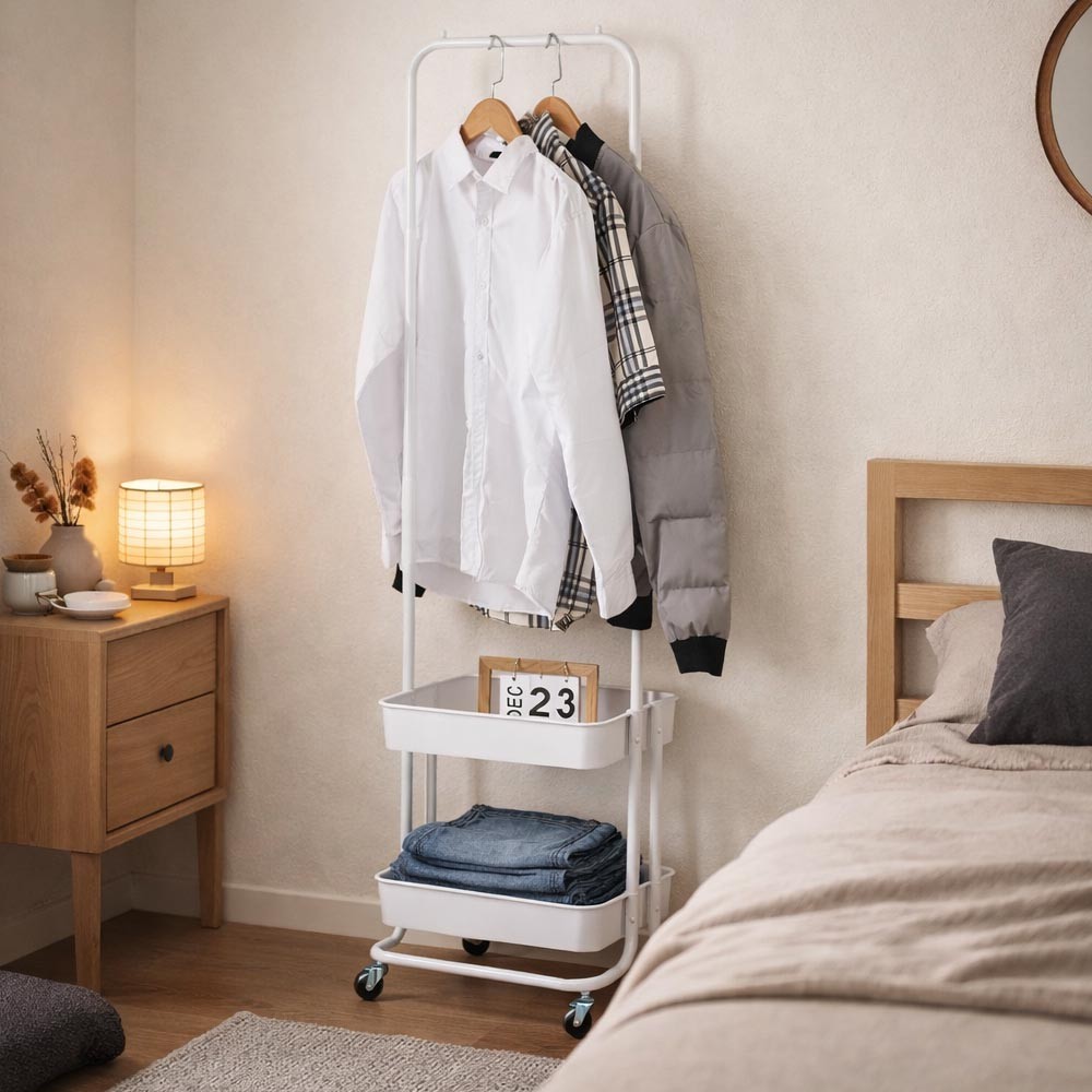 Κρεμάστρα ρούχων με μεταλλικό σκελετό βαμμένο με πούδρα και πλαστικά ράφια αποθήκευσης. Διαθέτει ρόδες για εύκολη μετακίνηση και προσφέρει ιδανική λύση για οργάνωση ρούχων και αξεσουάρ σε υπνοδωμάτιο, γραφείο ή επαγγελματικούς χώρους. Ο συνδυασμός μεταλλικού πλαισίου και πλαστικών καλαθιών προσφέρει σταθερότητα και πρακτικότητα. Διαστάσεις προϊόντος: Υ150x45x35εκ., συσκευασίας: 43,5×34×14,5 εκ. Βάρος: 3,00 κιλά.