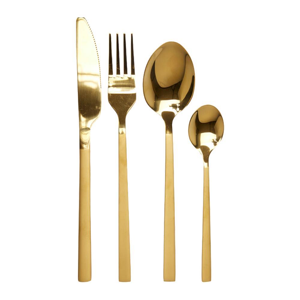 Σετ 16 ανοξείδωτα μαχαιροπίρουνα με κομψή χρυσή απόχρωση και σατινέ λαβή με επικάλυψη PVD. Κατασκευασμένα από ανοξείδωτο ατσάλι 18/0, συνδυάζουν ανθεκτικότητα και στυλ, ιδανικά για καθημερινή χρήση αλλά και για γιορτινό τραπέζι. Είναι κατάλληλα για πλυντήριο πιάτων.