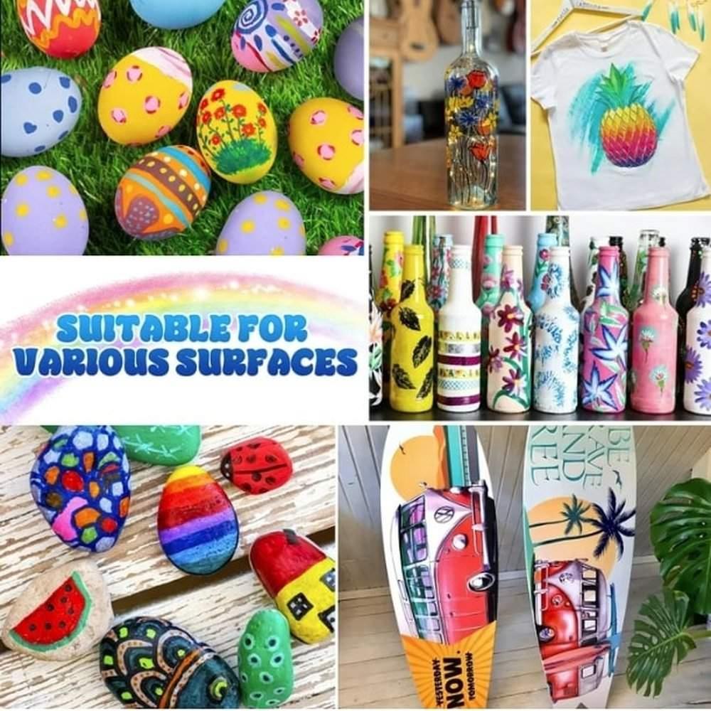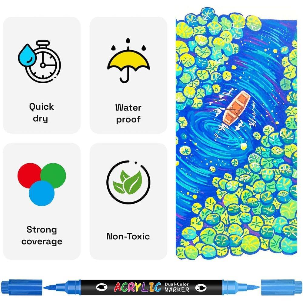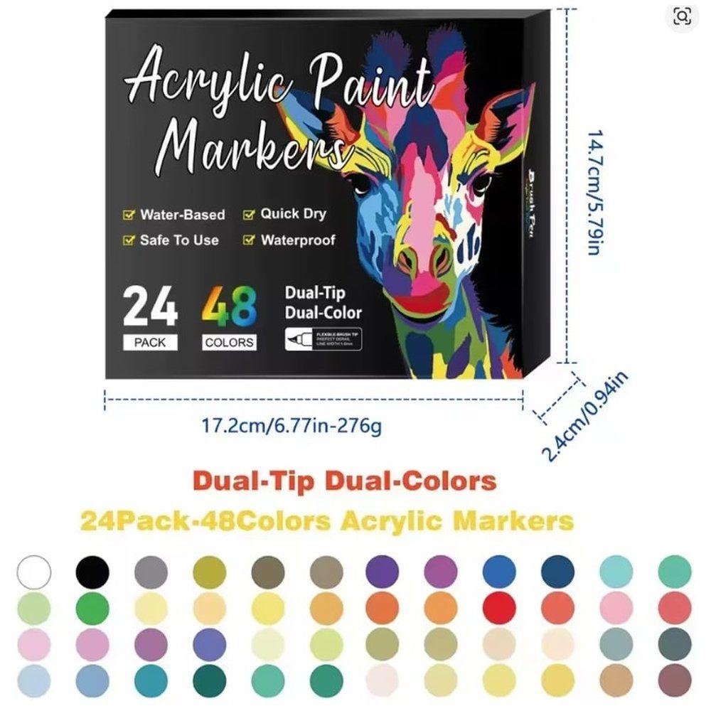 Σετ 24 ακρυλικών μαρκαδόρων διπλής όψης με δύο διαφορετικά χρώματα σε κάθε μαρκαδόρο, προσφέροντας συνολικά 48 αποχρώσεις. Διαθέτουν μαλακή brush μύτη για ευκολία στη χρήση και έντονη χρωματική απόδοση, ιδανικοί για ζωγραφική σε πέτρα, ξύλο, γυαλί, ύφασμα αλλά και DIY κατασκευές. Με βάση το νερό, γρήγορο στέγνωμα και ανθεκτικότητα στο νερό, προσφέρουν απόλυτο έλεγχο και εντυπωσιακά αποτελέσματα σε κάθε επιφάνεια.