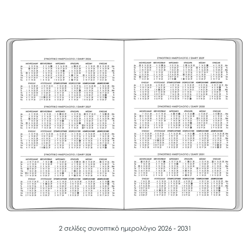 Περιέχει 2 σελίδες συνοπτικό πλάνο 2026-2031, 13 σελίδες μηνιαίο πλάνο και 176 σελίδες εβδομαδιαίο πλάνο (χωρίς ημερομηνίες, δεξιά πλευρά σημειώσεις). Ατομική συσκευασία με θερμοσυρίκνωση, δυνατότητα εκτύπωσης logo ή ονόματος και δυνατότητα πλήρους προσωποποίησης (logo στη ρίγωση, χαρτί σαμουά, ένθετα κ.α).