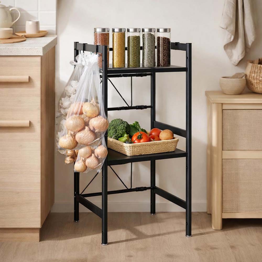 Μεταλλική ραφιέρα 3 επιπέδων με ανθεκτική επίστρωση πούδρας για μεγαλύτερη αντοχή και εύκολο καθάρισμα. Ιδανική για τοποθέτηση σε μπάνιο, κουζίνα ή αποθήκη, με σταθερή κατασκευή και πρακτικό σχεδιασμό που προσφέρει άνετη αποθήκευση και οργάνωση. Διατάσεις προϊόντος: 38–60×37,5×81εκ., συσκευασίας: 83×38,5×5,5 εκ. Βάρος: 5,20 κιλά
