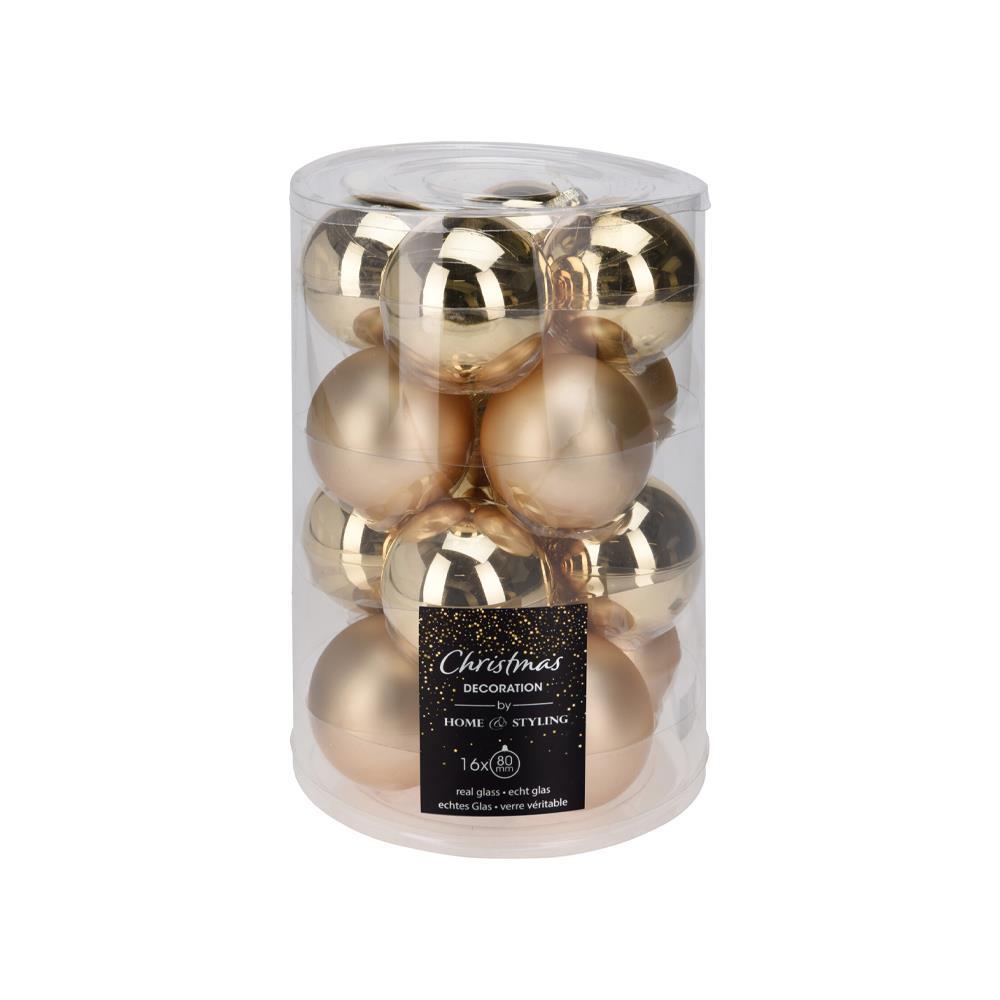Σετ 16 χριστουγεννιάτικων γυάλινων μπαλών Ø8εκ. σε χρυσό χρώμα, με 8 ματ και 8 γυαλιστερές. Η κομψή διπλή υφή τους χαρίζει εντυπωσιακό αποτέλεσμα και πολυτέλεια στον στολισμό του δέντρου. Ιδανικές για μεγαλύτερα δέντρα ή για όσους θέλουν ένα πιο έντονο διακοσμητικό στοιχείο στις γιορτές.