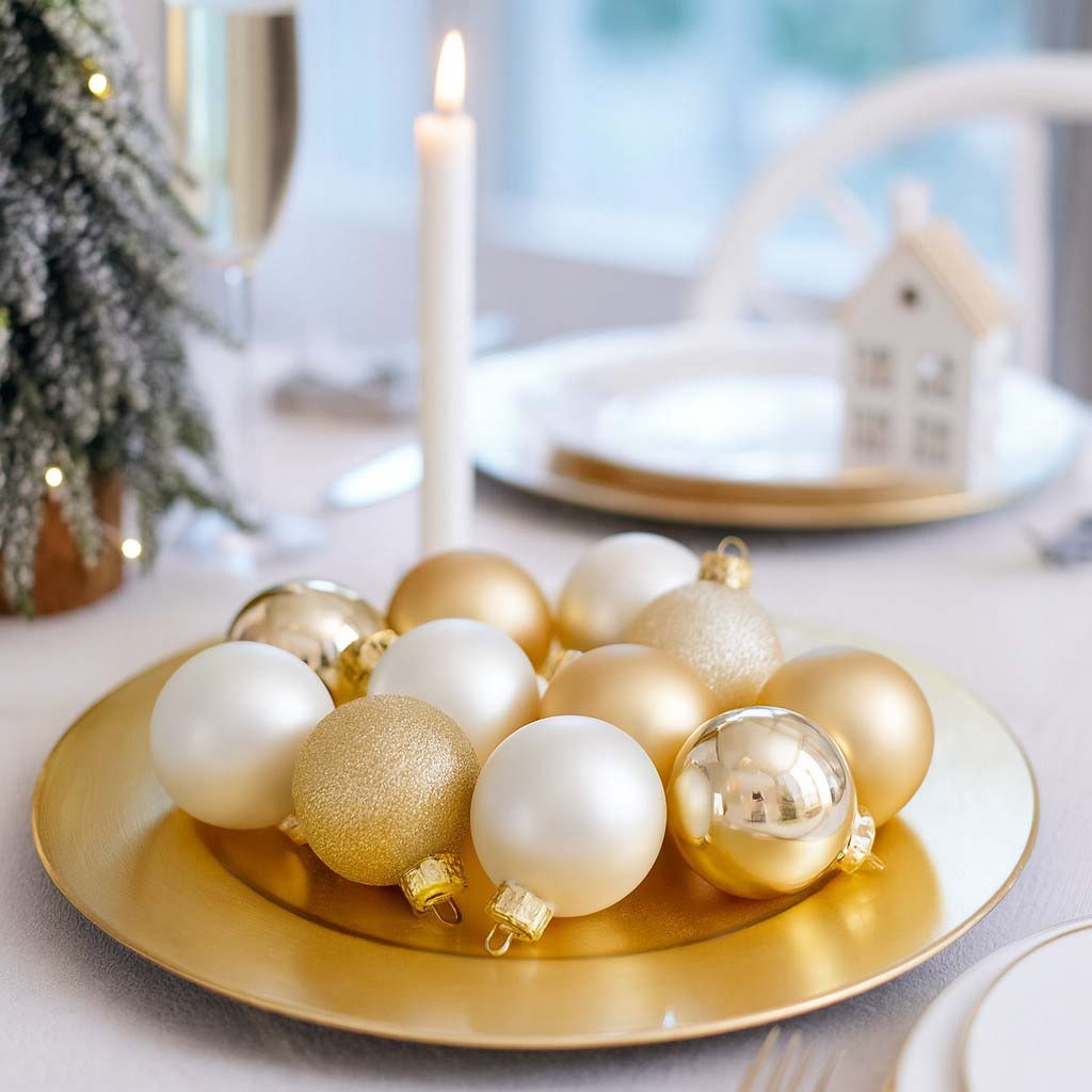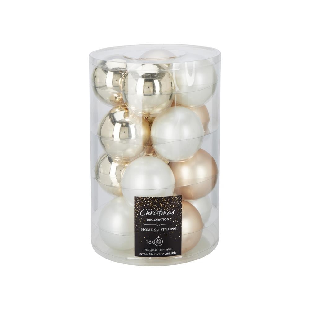 Σετ 16 χριστουγεννιάτικων γυάλινων μπαλών Ø8εκ. σε σε αποχρώσεις σαμπανιζέ γυαλιστερό, λευκό περλέ και σαμπανιζέ ματ. Ιδανικές για μεγαλύτερα δέντρα ή για όσους θέλουν ένα πιο έντονο διακοσμητικό στοιχείο στις γιορτές.