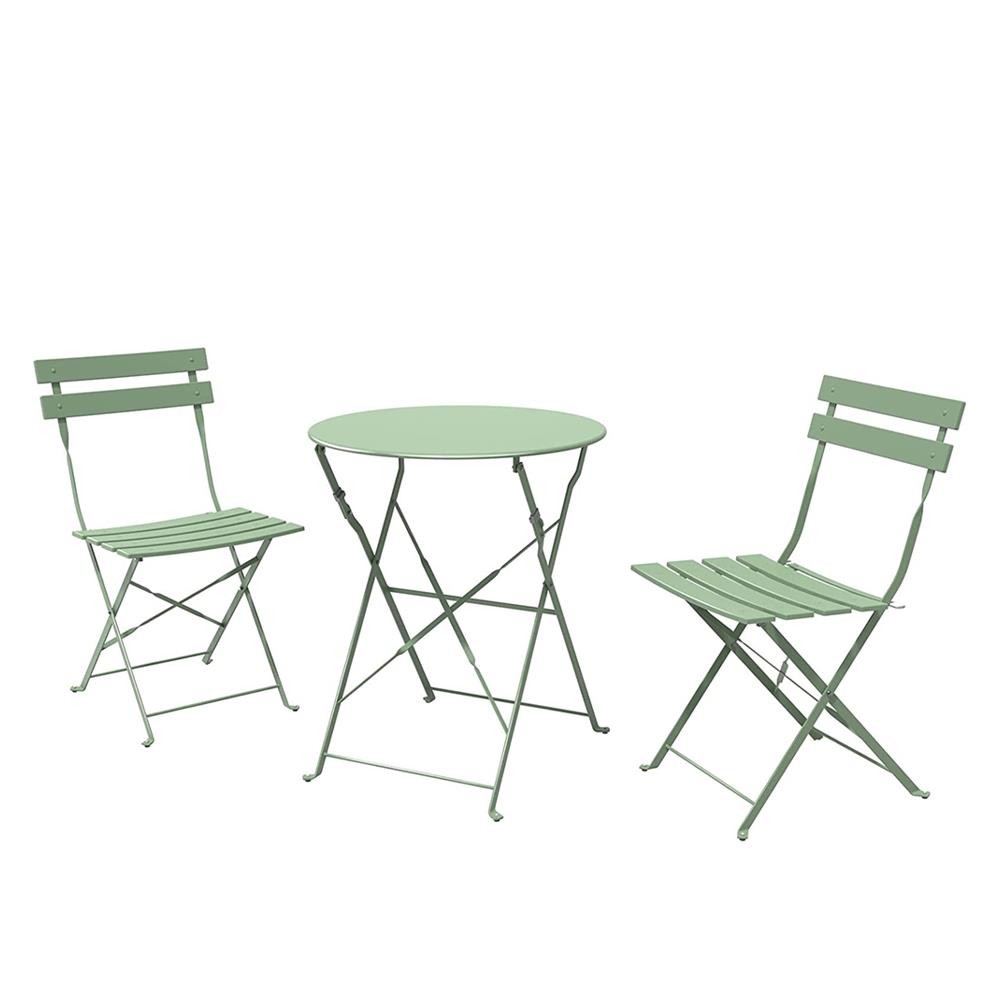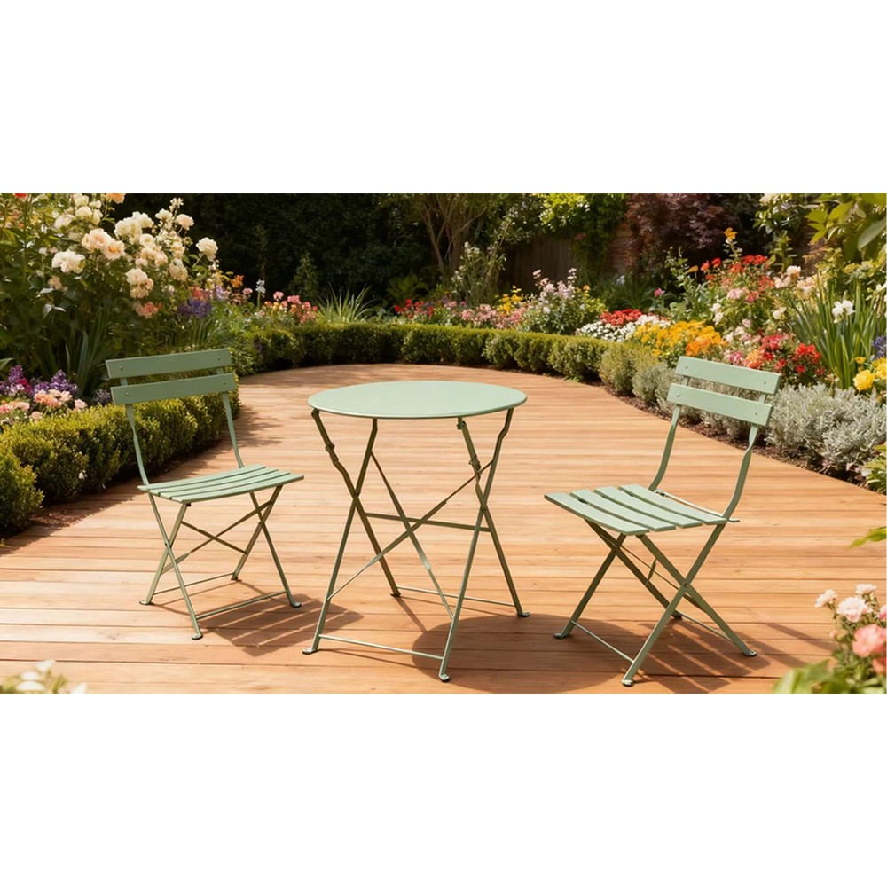 Ανανέωσε τον εξωτερικό σου χώρο με το σετ 3 τεμαχίων Nextdeco σε απόχρωση μέντα. Περιλαμβάνει στρογγυλό τραπέζι και δύο καρέκλες, όλα πτυσσόμενα για άνετη αποθήκευση και εύκολη μεταφορά. Κατασκευασμένο από ανθεκτικό ατσάλι με ηλεκτροστατική βαφή πούδρας, το σετ προσφέρει αντισκωριακή προστασία και είναι ιδανικό για χρήση σε κήπο, μπαλκόνι ή βεράντα.