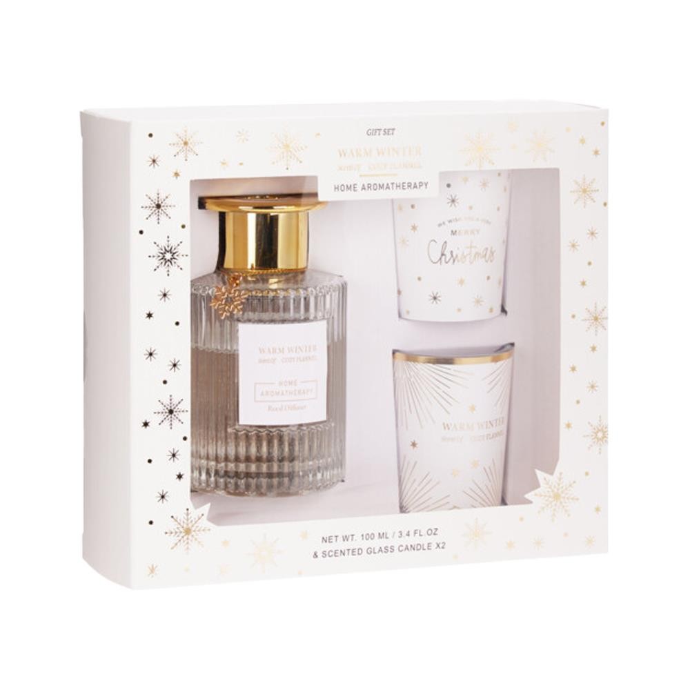 Αναβαθμίστε τη διακόσμηση και την ατμόσφαιρα του χώρου σας με αυτό το κομψό σετ που περιλαμβάνει ένα αρωματικό diffuser και δύο αρωματικά κεριά σε γυάλινα δοχεία με ιδιαίτερα σχέδια. Ιδανικά για το σαλόνι, υπνοδωμάτιο ή και ως ιδιαίτερη χριστουγεννιάτικη προσθήκη.