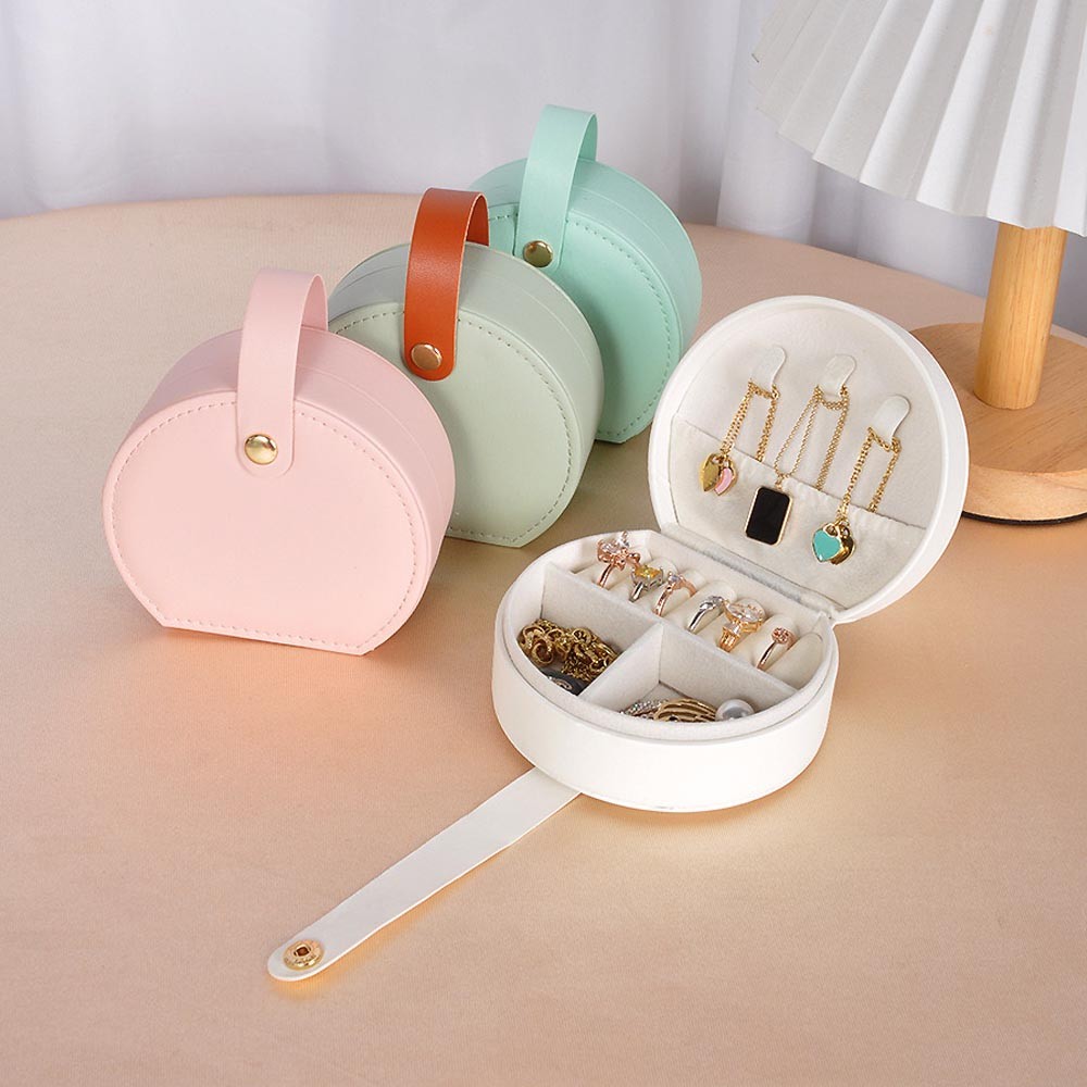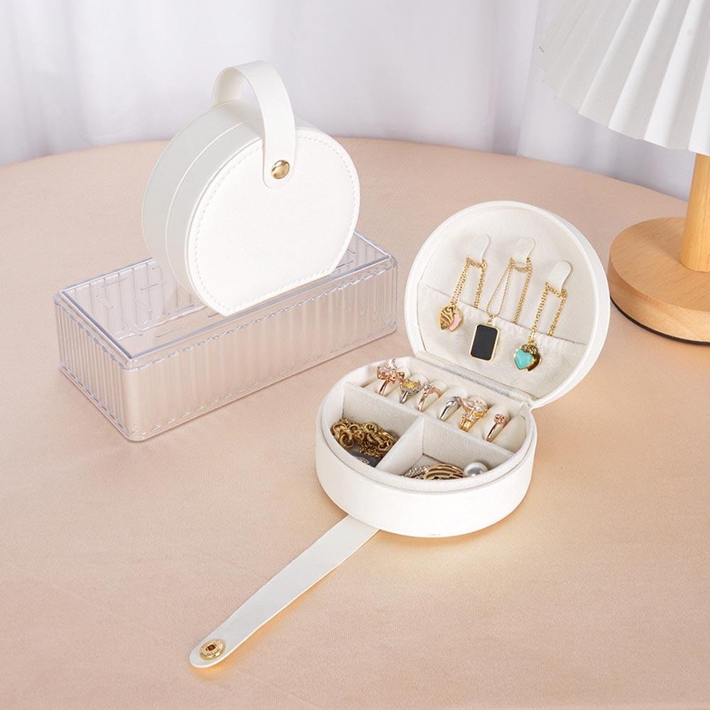 Μικρή και πρακτική στρόγγυλη λευκή θήκη κοσμημάτων με μοντέρνο λουράκι κουμπώματος. Ιδανική για ταξίδια, δώρα ή καθημερινή αποθήκευση κοσμημάτων στο σπίτι.