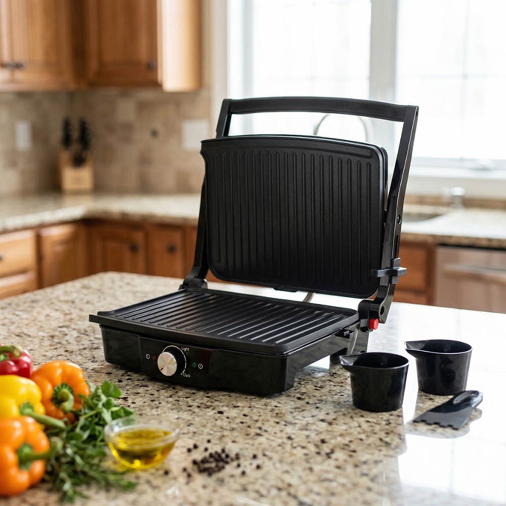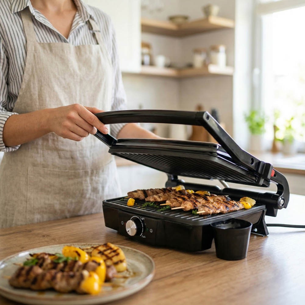Η κατασκευή της επιτρέπει το ψήσιμο χωρίς προσθήκη λίπους, ενώ η ειδική έξοδος αποστράγγισης βοηθά στην απομάκρυνση των υγρών κατά το ψήσιμο. Διαθέτει ενδείξεις λειτουργίας και θερμοκρασίας, καθώς και σταθερή βάση για ασφαλή χρήση.