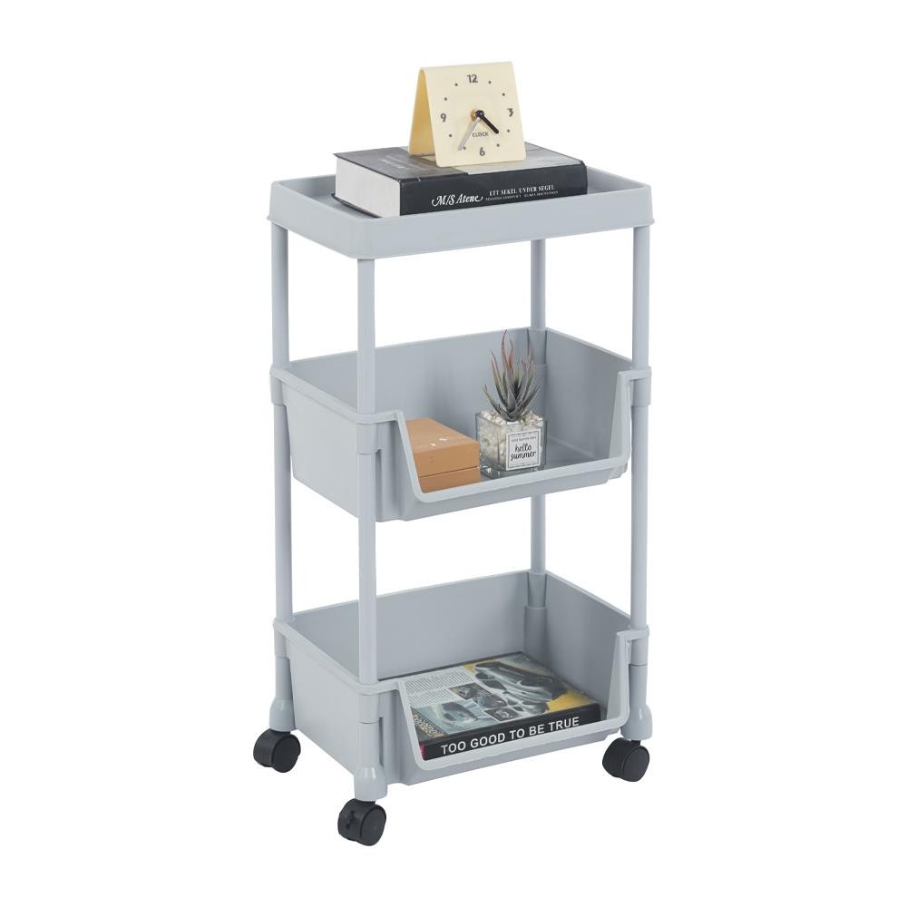 Πλαστικό τρόλεϊ - καλάθι 3 επιπέδων από ανθεκτικό PP και σωλήνες PVC, με ρόδες για εύκολη μετακίνηση. Ιδανικό για αποθήκευση μικροαντικειμένων σε κουζίνα, μπάνιο, γραφείο ή επαγγελματικούς χώρους. Ο μοντέρνος σχεδιασμός του προσφέρει πρακτικότητα και καθαρή αισθητική σε κάθε περιβάλλον. Χρώμα: Γκρι, Διαστάσεις προϊόντος: Υ63x34x25εκ., συσκευασίας: 36×27×22 εκ. Βάρος: 1,20 κιλά.