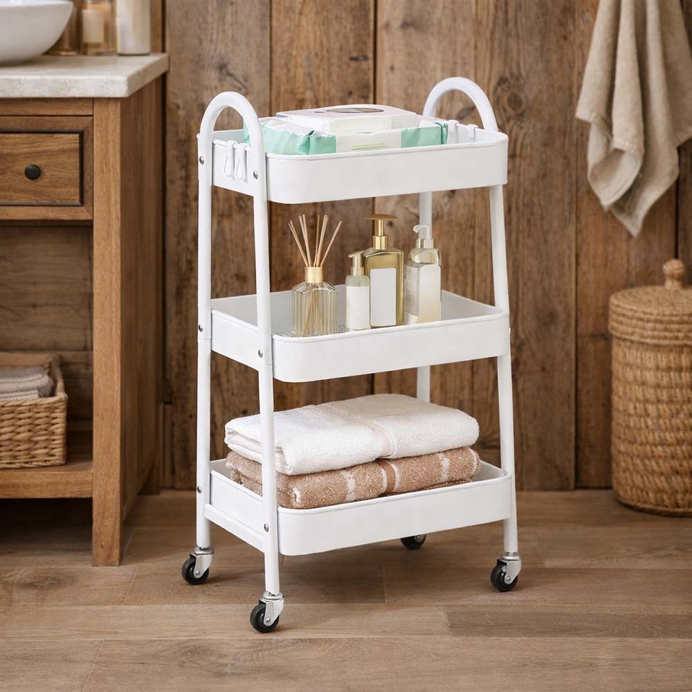 Μεταλλικό τρόλεϊ 3 επιπέδων με ανθεκτική κατασκευή και επίστρωση πούδρας για προστασία από τη φθορά και τη σκουριά. Διαθέτει ρόδες για εύκολη μετακίνηση και είναι ιδανικό για χρήση σε κουζίνα, μπάνιο ή γραφείο, προσφέροντας πρακτική αποθήκευση σε περιορισμένο χώρο. Χρώμα: Λευκό, Διαστάσεις προϊόντος: 42,5×29,5×75 εκ., συσκευασίας: 43×30×7,7 εκ. Βάρος: 2,70 κιλά.