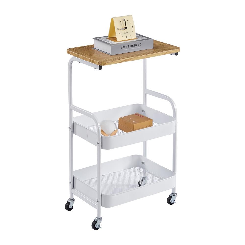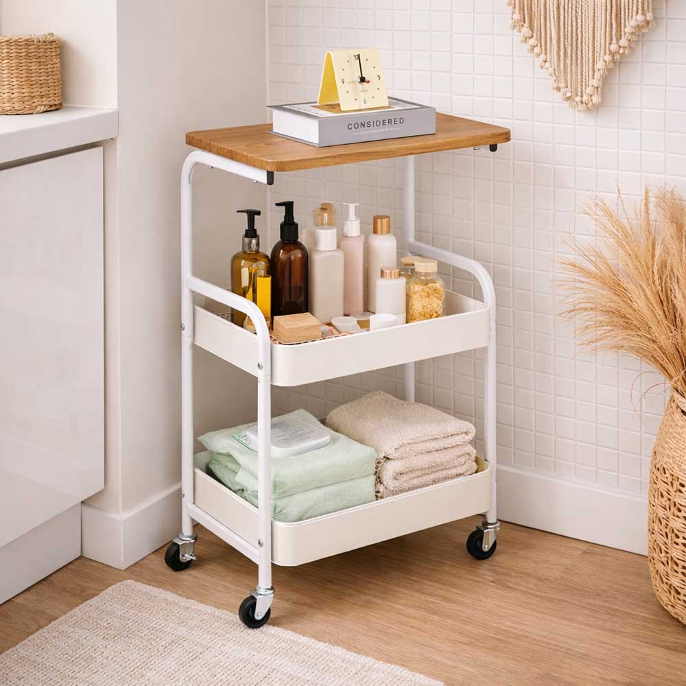 Μεταλλικό τρόλεϊ με λευκό σκελετό βαμμένο με πούδρα και επιφάνεια MDF με επικάλυψη PVC σε ανοιχτή καφέ απόχρωση. Διαθέτει ξύλινη επιφάνεια, δύο καλάθια αποθήκευσης και ρόδες για εύκολη μετακίνηση. Ιδανικό για χρήση σε κουζίνα, γραφείο ή σαλόνι. Μπορεί επίσης να χρησιμοποιηθεί ως βοηθητικό τραπέζι ή τρόλεϊ σε επαγγελματικούς χώρους και ιατρεία. Χρώμα: Λευκό. Διαστάσεις προϊόντος: 43×30×77 εκ., συσκευασίας: 44×30,5×11 εκ. Βάρος: 3,65 κιλά.