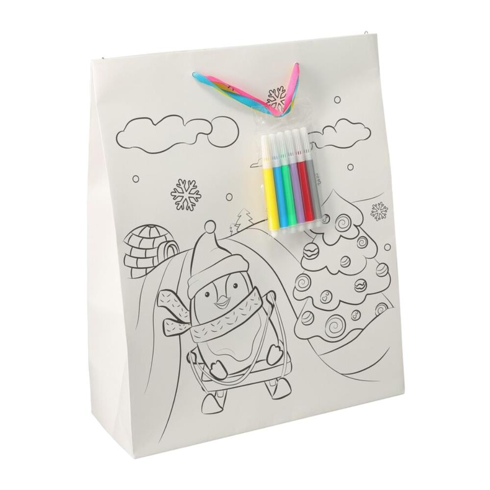 Χριστουγεννιάτικη τσάντα δώρου με ενσωματωμένο σετ μαρκαδόρων ζωγραφικής για ατελείωτη δημιουργία! Διαθέτει 4 διαφορετικά σχέδια με εορταστικά μοτίβα, ιδανικά για να τα χρωματίσουν παιδιά και ενήλικες. Κατασκευασμένη από ανθεκτικό χαρτί 170 g/m², FSC Mix Credit, συνδυάζει τη χρηστικότητα με τη διασκέδαση. Αποτελεί υπέροχη πρόταση για συσκευασία δώρων ή δημιουργική δραστηριότητα. Διαστάσεις προϊόντος: 23×18×10 εκ.