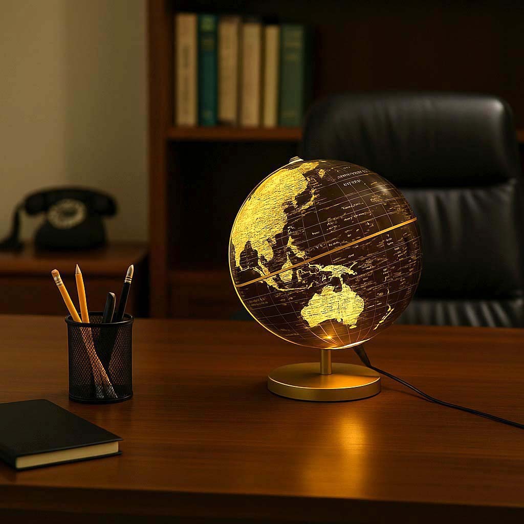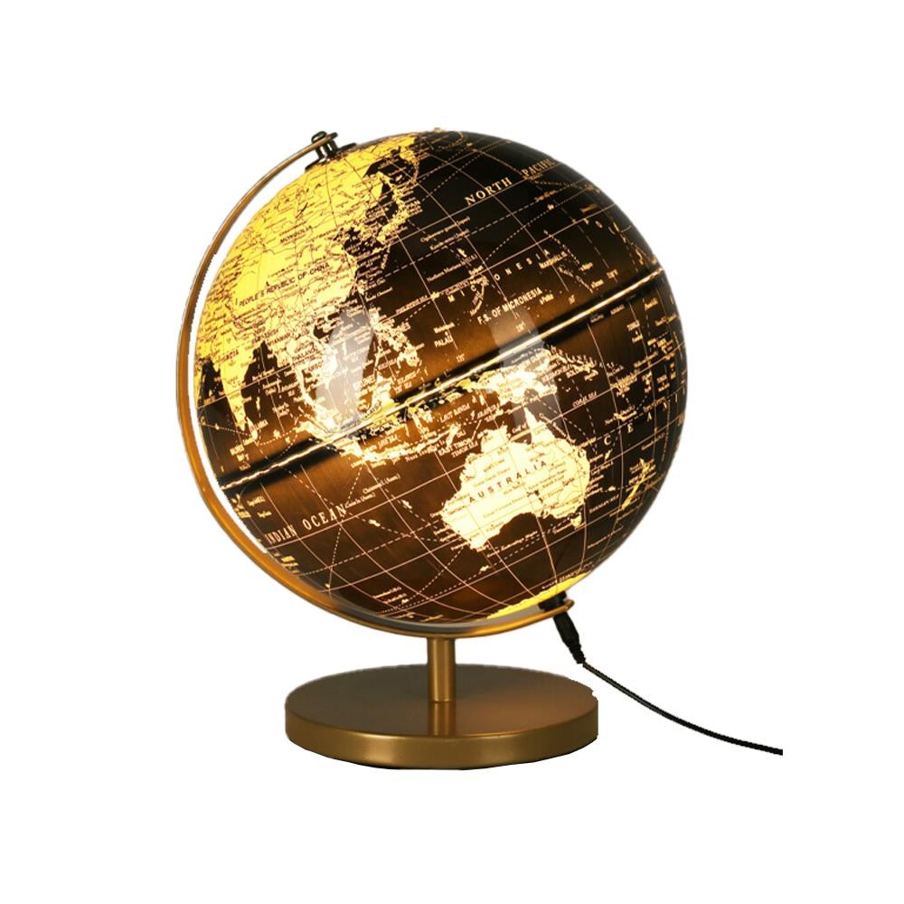 Κομψή διακοσμητική υδρόγειος σφαίρα με φωτισμό LED, ιδανική για να προσθέσει στυλ και ιδιαίτερη ατμόσφαιρα στο γραφείο ή το καθιστικό. Η μαύρη επιφάνεια με χρυσές λεπτομέρειες δένει αρμονικά με τη μεταλλική χρυσή βάση, ενώ οι τέσσερις θερμές λευκές LED λάμπες δημιουργούν ευχάριστο φωτισμό. Συνδέεται εύκολα με καλώδιο USB και αποτελεί μοναδική επιλογή δώρου ή διακοσμητικού στοιχείου.
